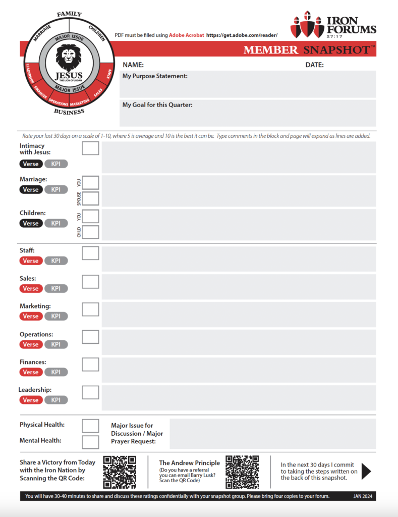 A typical day at the Iron Forums begins as members arrive at 7:15 a.m. for coffee and a 7:30 a.m. start time with breakfast. The Forum facilitator takes us through the first two hours with a presentation on a specific topic facing Christian business owners, followed by an opportunity for group discussion. At approximately 9:30 a.m., we break out into tables of 3-4 for Snapshot Groups led by a table leader for small group discussion. Around 11:30 lunch is served and we end the day at 1:00 p.m.